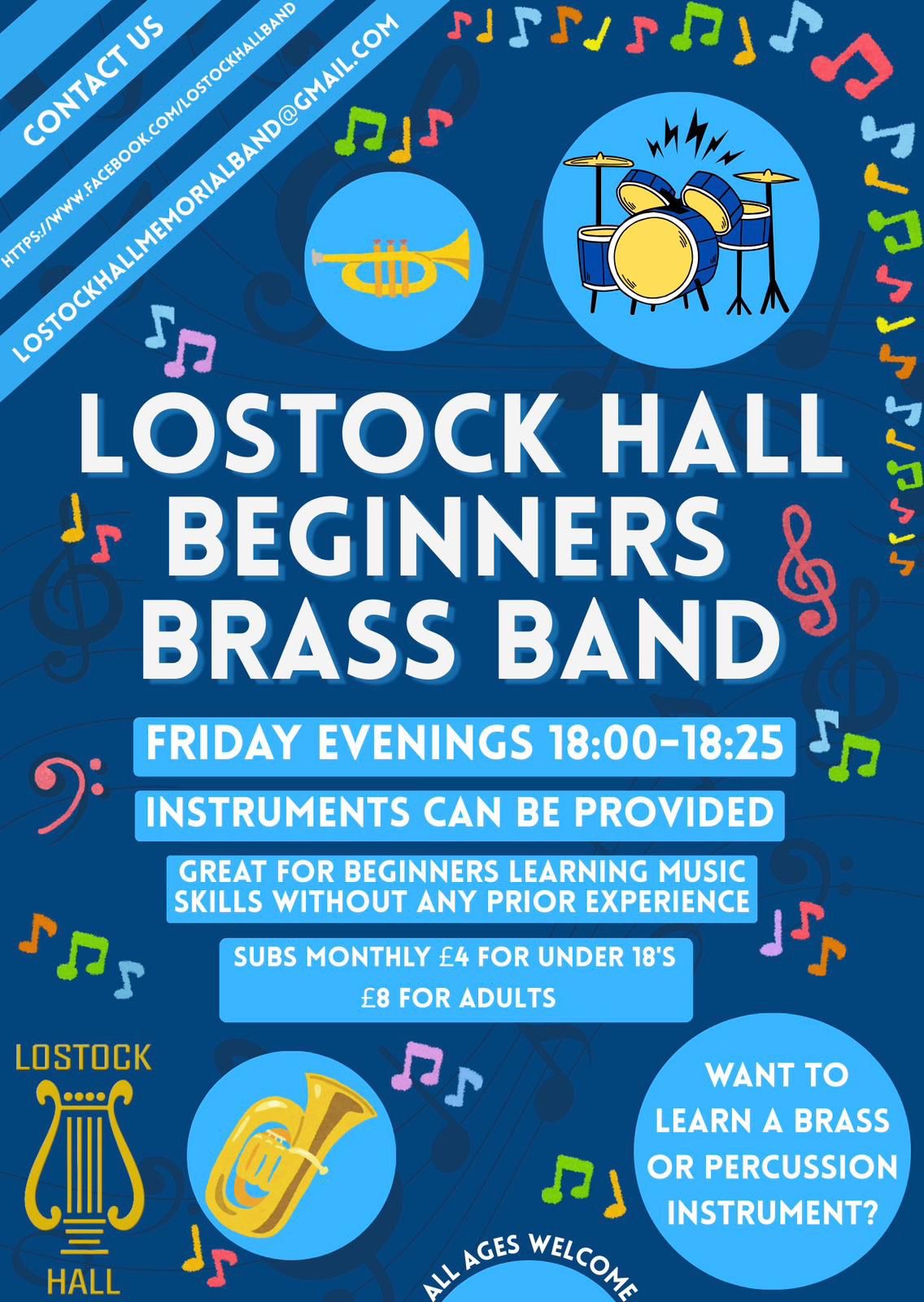 Lostock Hall Training Band has been established for a great number of years with the intention of both offering affordable brass tuition to the local community, and cultivating the talent which will sustain the main Lostock Hall Memorial Band. The training band offers tuition in either brass or percussion, free loan of an instrument, sheet music and learning materials in addition to ensemble rehearsals and the opportunity to perform at a variety of concerts throughout the year. The band embraces players of all ages and levels of ability, welcoming beginners as well as more experienced players.